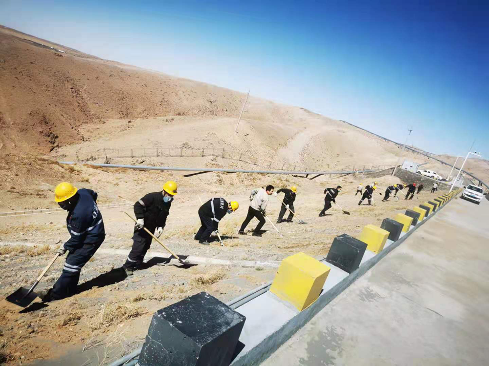 本次活動重點對基礎(chǔ)壩兩側(cè)坡面進(jìn)行綜合治理,治理長度約1.5公里。面對坡陡、風(fēng)大、黃沙亂舞的工作環(huán)境,黨員干部不懼困難、以身作則、俯沖一線,帶頭撿拾垃圾、清理尾砂、覆土灑水以及對安全警示牌進(jìn)行維護(hù)保養(yǎng)。廣大職工緊跟其后,或一字排開,或矩陣展開,忙碌的身影遍布整個坡面,鏟車的轟鳴聲、鐵锨的吱吱聲與狂風(fēng)的呼嘯聲琴簫合奏,在藍(lán)天、斜陽和荒山的襯托下,勾勒出一幅“聲與色”、“動與靜”相得益彰的勞動生產(chǎn)畫卷。